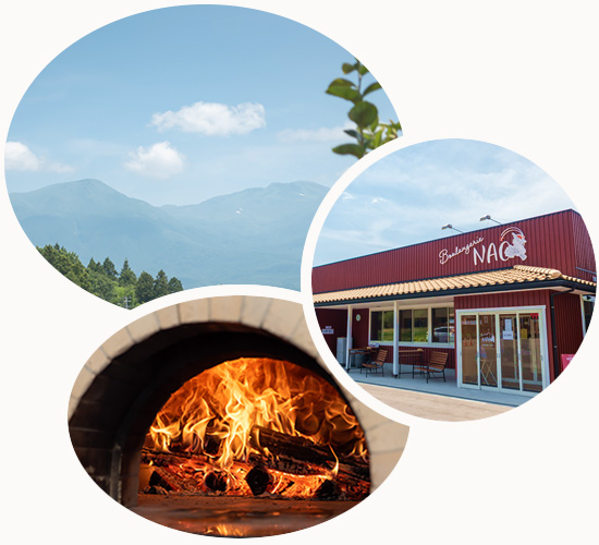 BoulangerieNAOは、山形県の北西に位置する遊佐町にあります。雄大な「鳥海山」を間近に望み、美味しい雪解けの湧水や地元で採れる豊かな作物で知られる町。当店は、その恵みを使って手作りでパンとピザを焼いているベーカリーです。